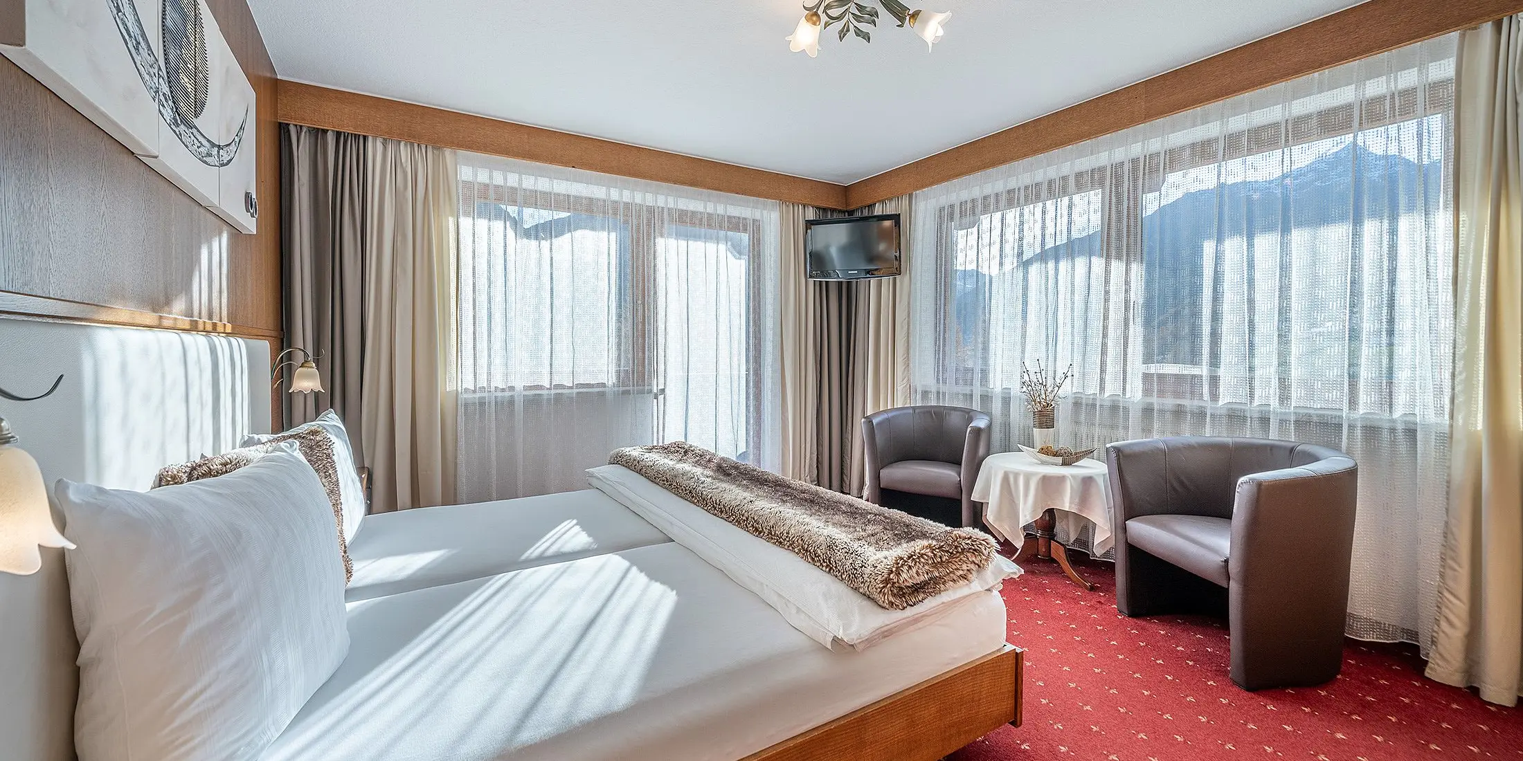 Geborgenheit sowie Rückzug gewähren Ihnen unsere behaglichen Komfortzimmer mit Balkon, Bad, Dusche, WC, Fön, Bademänteln, Telefon, Zimmersafe, TV, kostenfreiem WLAN und Blick auf die faszinierende Ötztaler Bergkulisse.